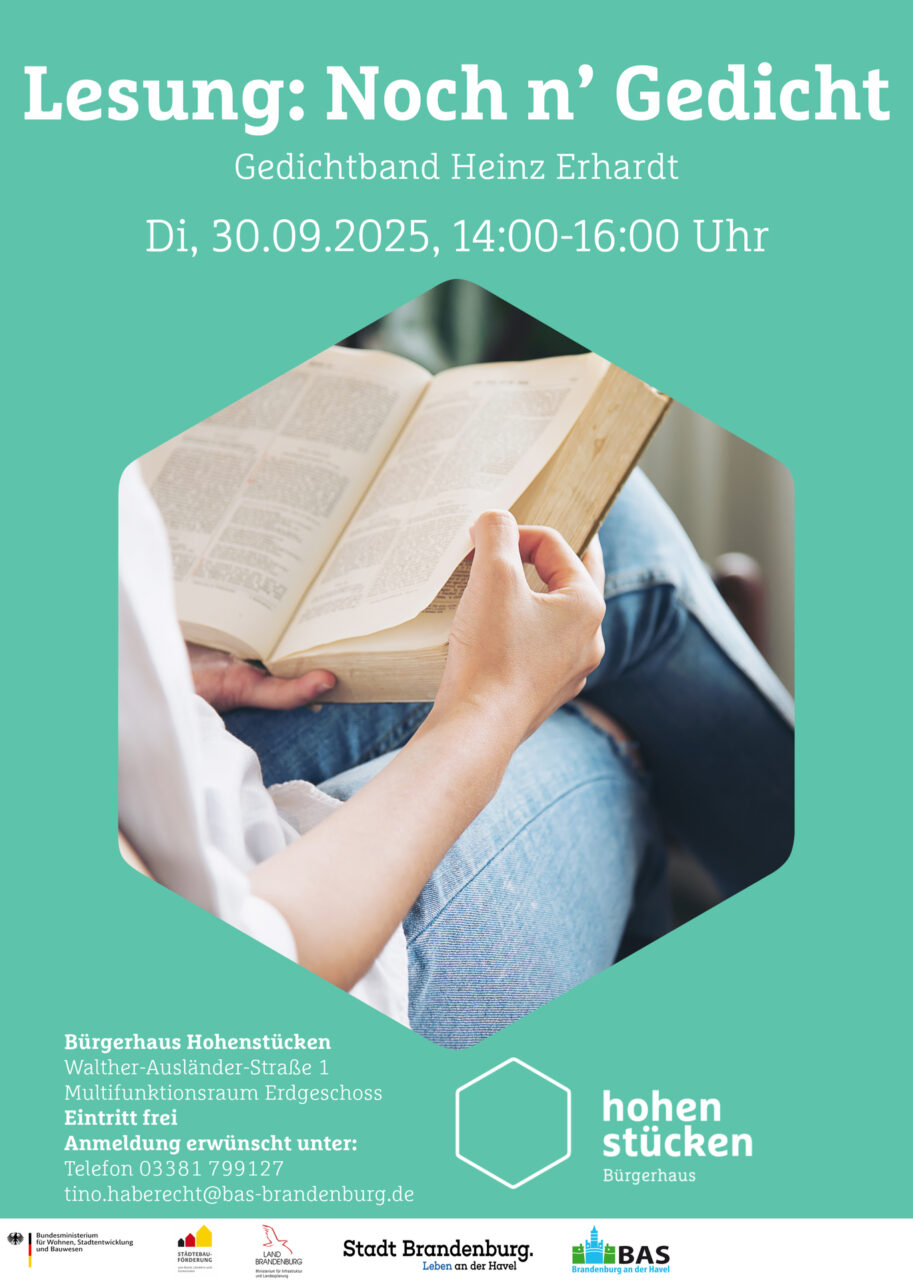 „Noch n‘ Gedicht“ im Bürgerhaus am 30.09.25 © Bürgerhaus Hohenstücken / T. Haberecht Am Dienstag, 30. September 2025, laden der Anwohnertreff und das Quartiersmanagement Hohenstücken zur gemütlichen Lesestunde „Noch n‘ Gedicht“ ein. Von 14:00 bis 16:00 Uhr werden im Multifunktionsraum (EG) des Bürgerhauses in der Walther-Ausländer-Straße 1 heitere und zeitlose Verse aus dem berühmten Gedichtband […]
