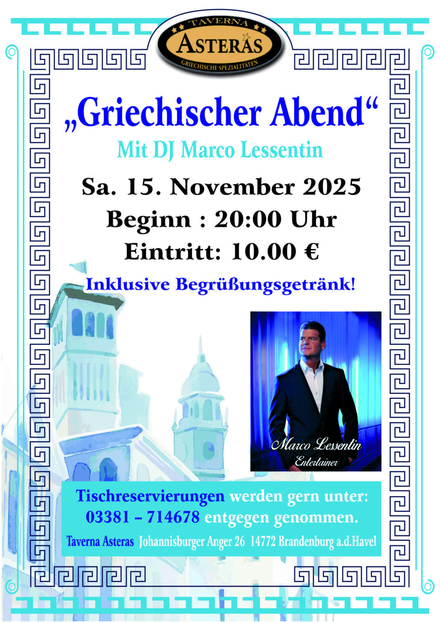 „Griechischer Abend mit DJ Marco Lessentin“ am 15.11.2025 im Restaurant Asteras Am 15.11.2025 findet in Restaurant Asteras der beliebet Griechische Abend mit DJ Marco Lessentin und mit viel Wunschmusik und guter Stimmung statt. Verbindliche Reserverungen werden gern unter : Telefon: 03381 714678 entgegengenommen. Beginn ist um 20:00 Uhr – ca. 00:30 Uhr Taverna […]