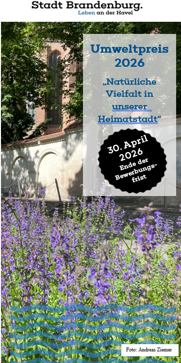„Natürliche Vielfalt in unserer Heimatstadt“ Umweltpreis 2026 – Projekte können bis zum 30. April 2026 eingereicht werden © Stadt Brandenburg an der Havel /Umweltamt Der Schutz des Klimas und die Verhinderung des Artensterbens sind wichtige Ziele auf der Agenda der globalen Gemeinschaft. Aus diesem Grund sind im Zeitraum von 2021 bis 2030 Anstrengungen zur Wiederherstellung […]