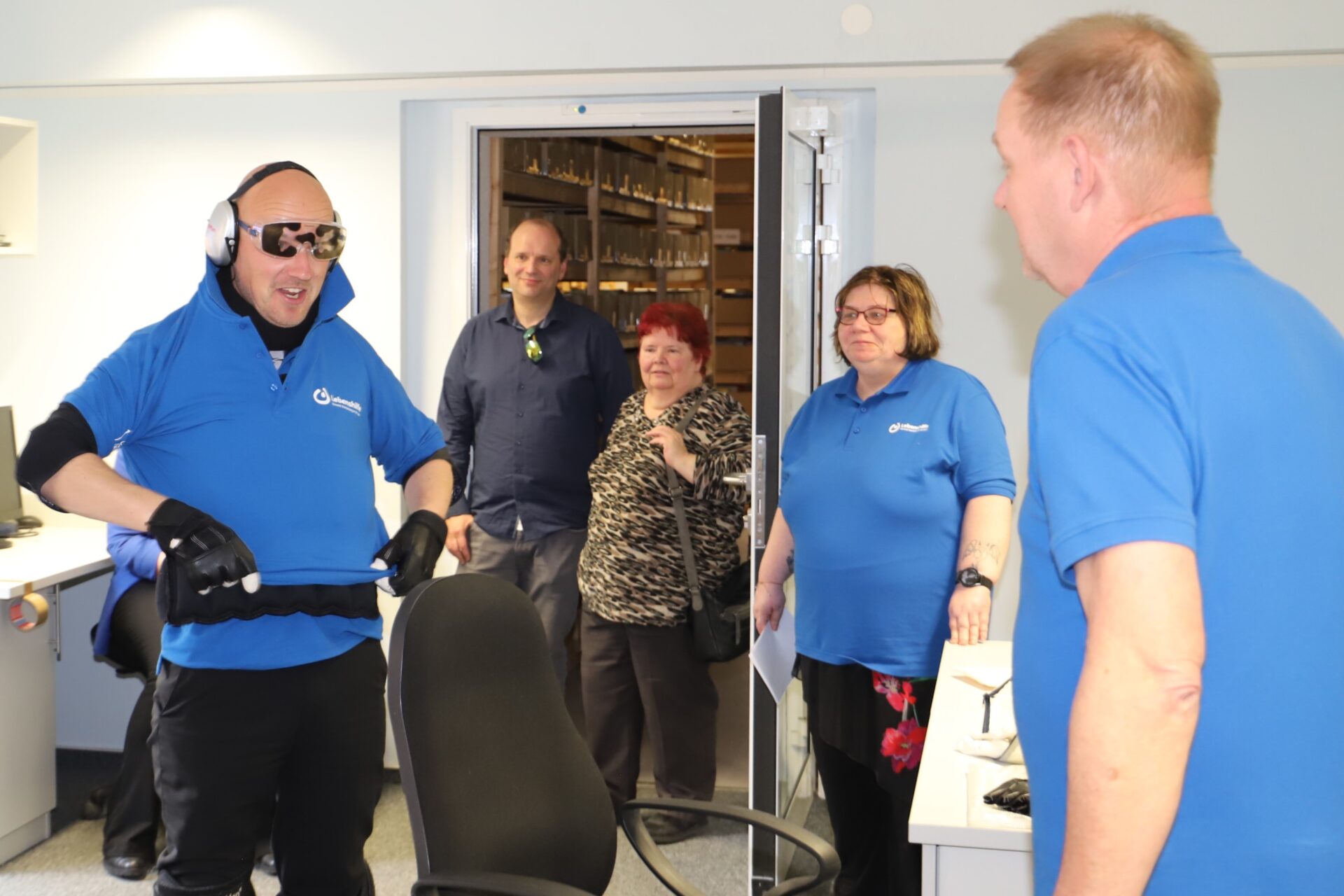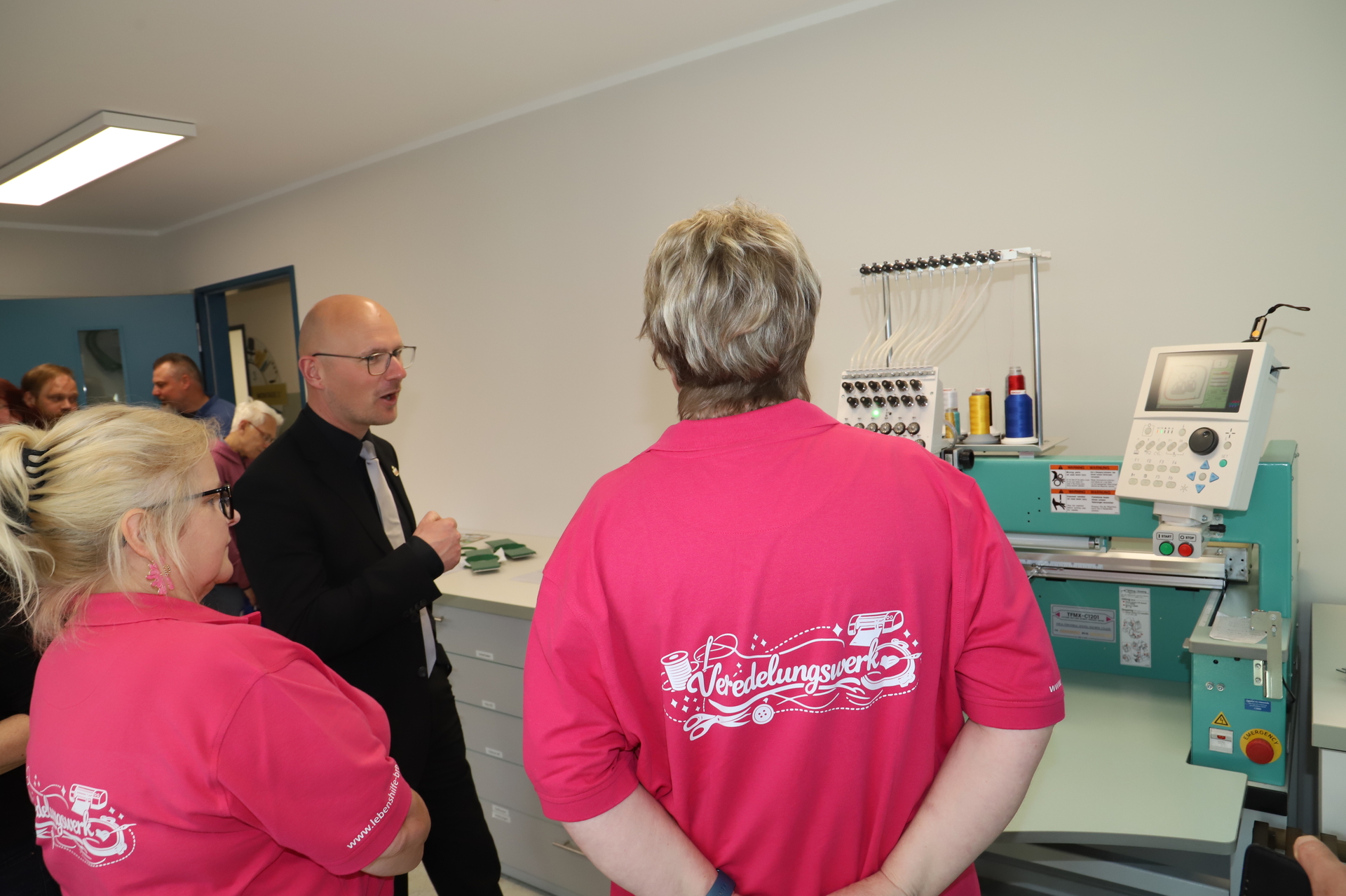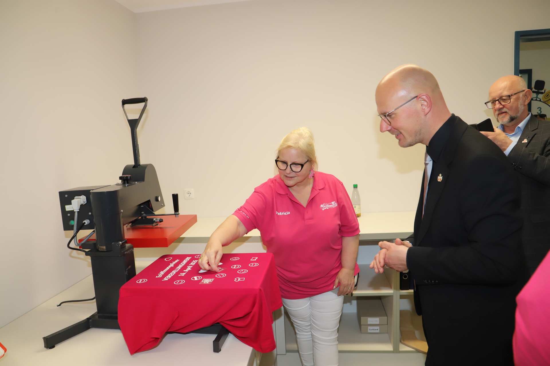 Auch Oberbürgermeister Daniel Keip war vor Ort. Er wurde von Vorstand und Mitarbeitenden empfangen und probierte selbst das Angebot aus. Er durfte sein eigenes T-Shirt bedrucken. Zudem erhielt er Einblicke in den inklusiven Online-Buchhandel „Schmökerhöker“ und probierte einen Alterssimulationsanzug und den Rollstuhlparcours aus. Thema war auch, wie Teamkleidung der Stadt künftig gestaltet werden kann.