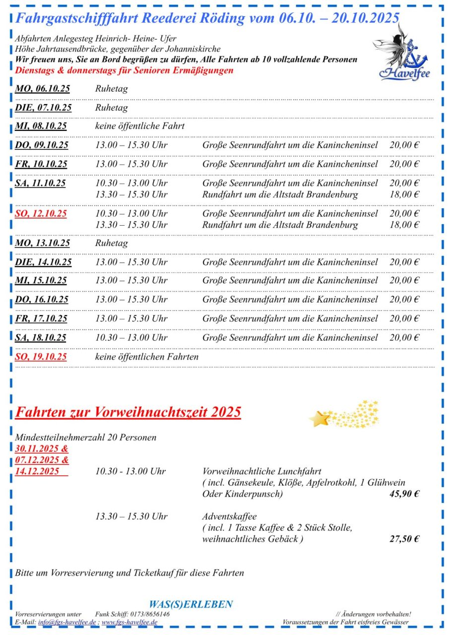 Startseite » Blog » Ab auf die Havelfee – Fahrplan vom 06.10.25 bis 20.10.25