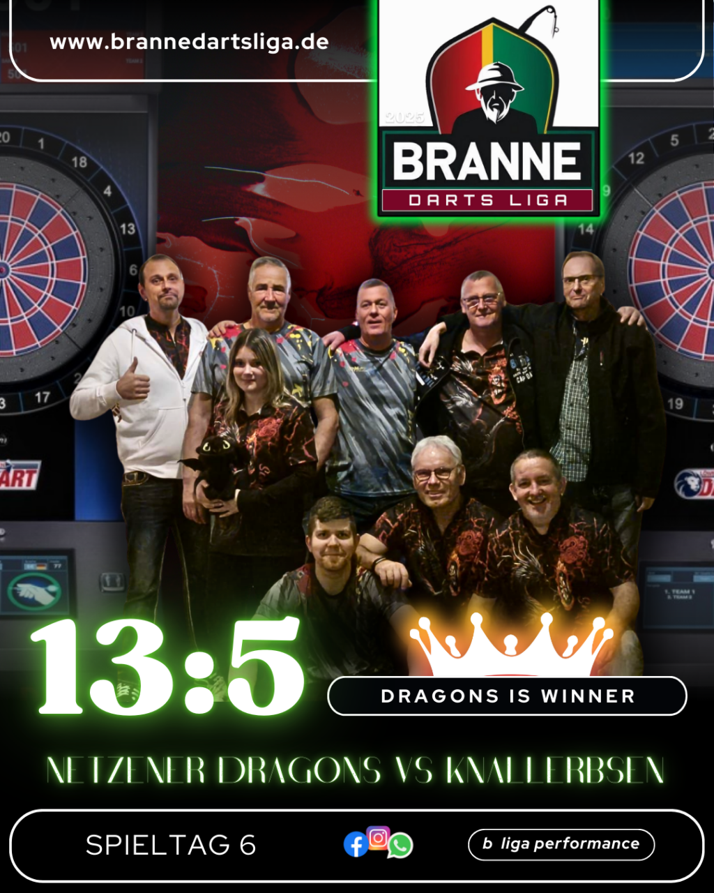 Die Netzener Dragons bleiben die einzige unbesiegbare Entität der gesamten Liga (6-0-0, 18 Punkte). Sie besiegten Die Knallerbsen souverän 13:5 (29:17 Legs).