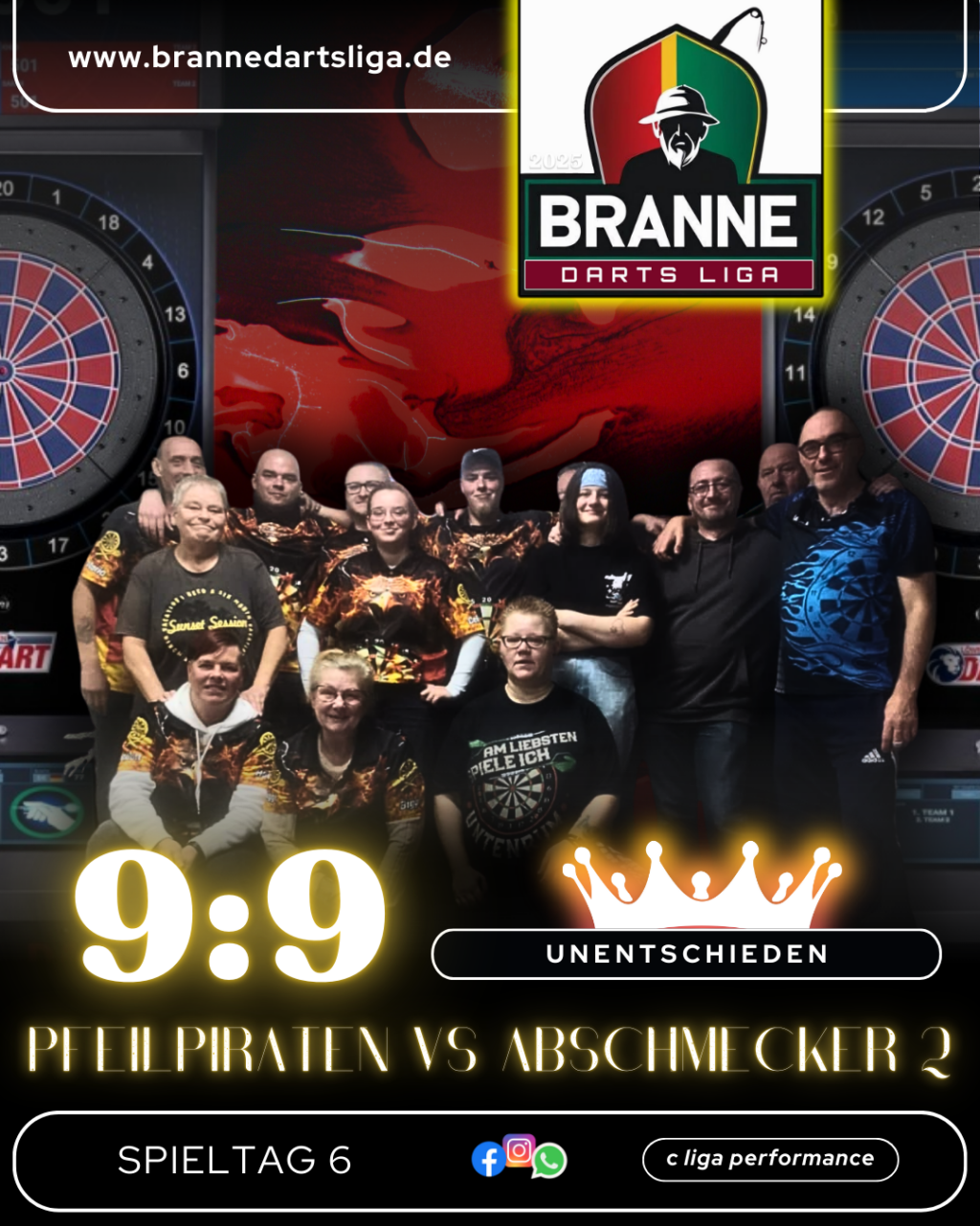 Der Horror-Keller sah einen seltenen Moment der Erlösung: Die Pfeilpiraten und Die Abschmecker 2 (die einzigen punktlosen Teams bis dato) trennten sich 9:9 (21:20 Legs). Beide Teams holten damit ihren ersten Punkt, was den Druck auf die „Eroberungs“-Mission der nächsten Spieltage mildert.
