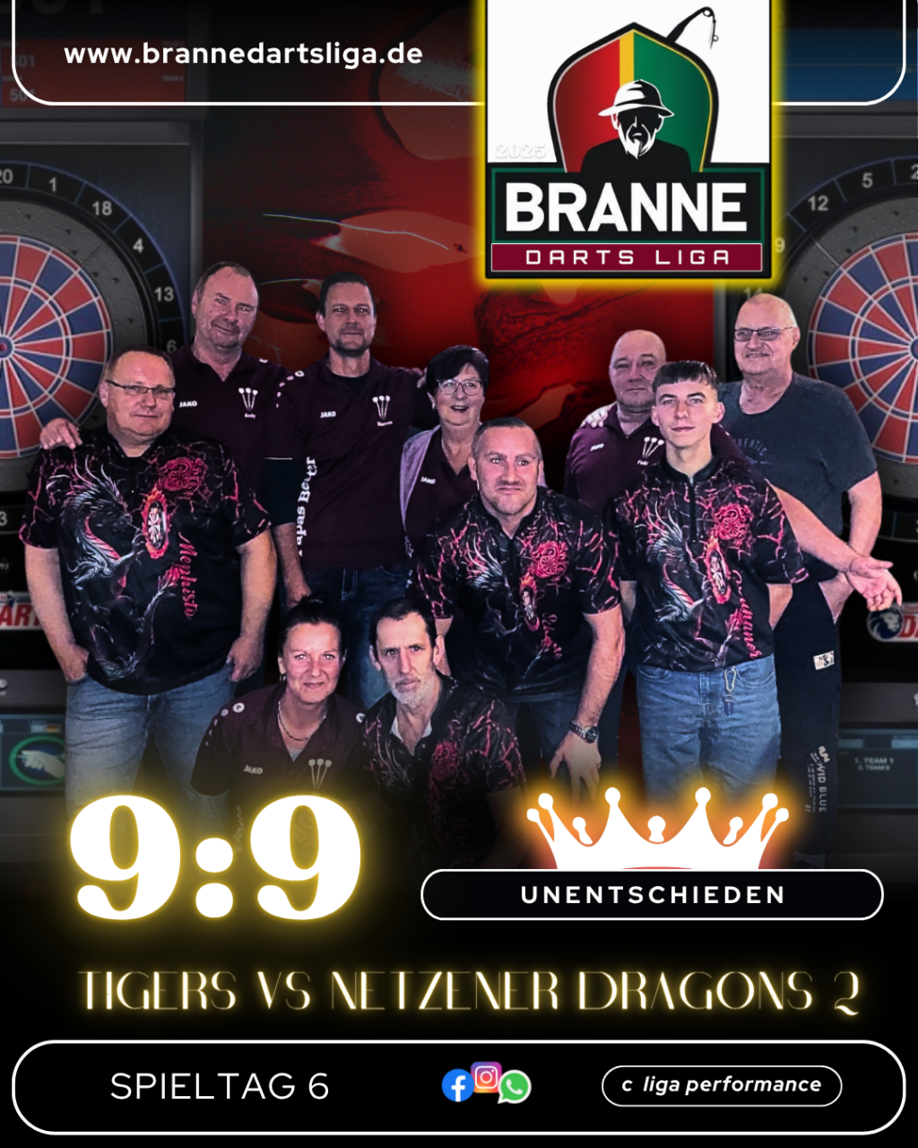 Netzener Dragons 2 musste sich nach einem zähen 9:9-Duell (24:23 Legs) gegen die Tigers mit dem zweiten Platz begnügen, bleiben aber ungeschlagen.