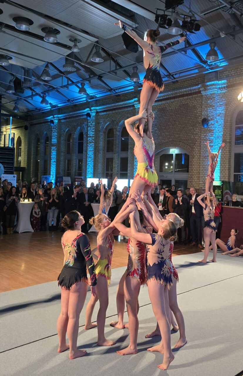Profitieren vom Einsatz der Wirtschaftsjunioren konnten auch die Sportakrobaten des FC Borussia Brandenburg, die zum Start des Empfangs mit einer tollen Show beigetragen hatten und sich später über die Jahresspende (500 Euro) der Wirtschaftsjunioren Brandenburg freuen konnten. Ein paar Spontanspenden gesellten sich im Laufe des Abends hinzu, sodass der Wunsch nach einer kostenintensiven Airtrack-Matte ein Großteil realistischer geworden ist.