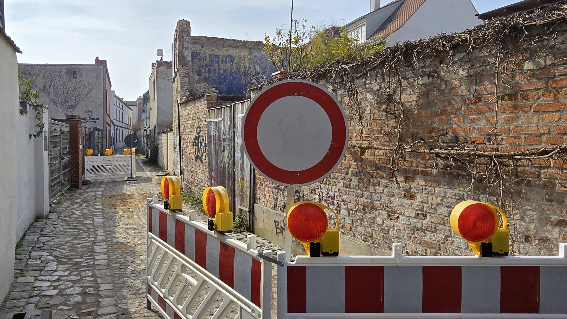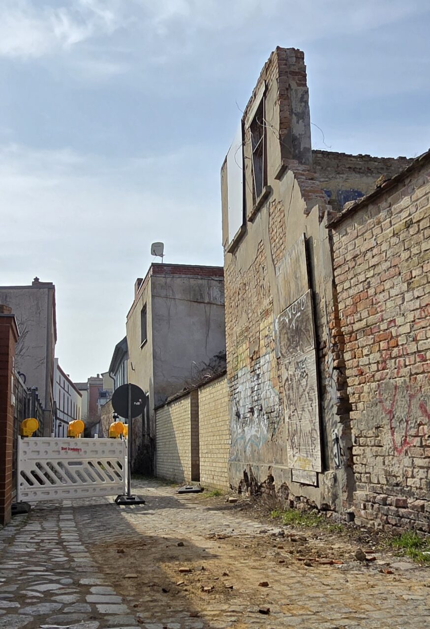 Seit am 28. Februar 2026 Teile der an die Kommunikation grenzenden Ruine, Nummer 8, herabgestürzt sind, hat die Bauaufsicht die sofortige Vollsperrung der schmalen Gasse angeordnet und sich mit dem Grundstückseigentümer in Verbindung gesetzt. Er sollte unverzüglich die Möglichkeiten eines Rückbaus im Rahmen der Gefahrenabwehr prüfen.
