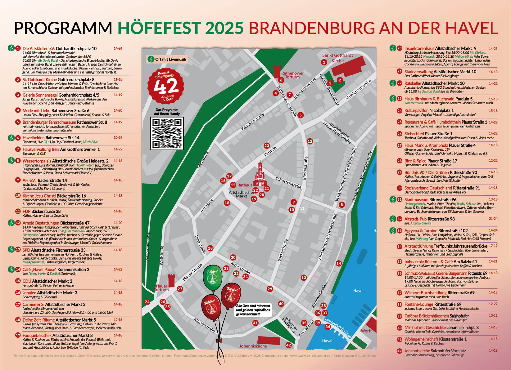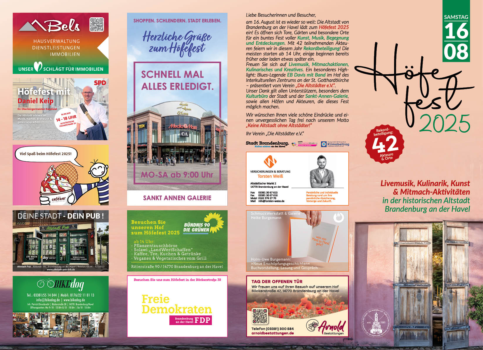 Am Samstag, dem 16. August 2025, verwandelt sich die historische Altstadt von Brandenburg an der Havel erneut in eine lebendige Bühne für das Höfefest. Organisiert vom Verein „Die Altstädter e.V.„, öffnet das Fest Türen und Tore zu verborgenen Höfen, Gärten und Plätzen und lädt Besucherinnen und Besucher zu einem Tag voller Musik, Kunst, Handwerk und kulinarischer Genüsse ein.