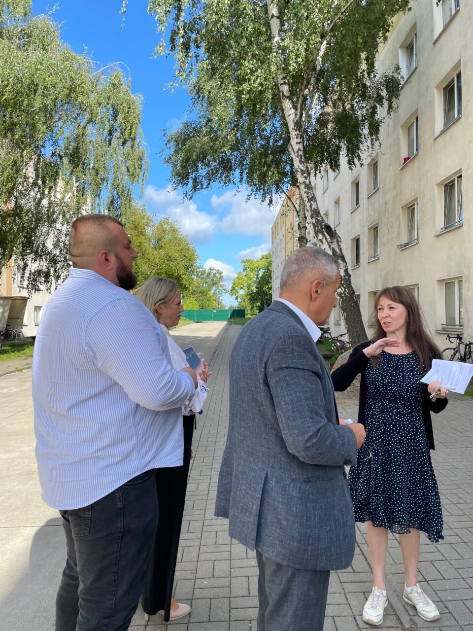 Am Vormittag besuchte Serhii Reznik die Gemeinschaftsunterkunft Upstallstraße 13, die unter anderem als Übergangsunterkunft für Geflüchtete aus der Ukraine dient. Bürgermeister Reznik stellte viele Fragen und kam mit Bewohnerinnen ins Gespräch – darunter zwei Frauen aus seiner Heimatregion. Er zeigte sich beeindruckt von der Unterkunft und der herzlichen Aufnahme der ukrainischen Menschen in Brandenburg an der Havel.