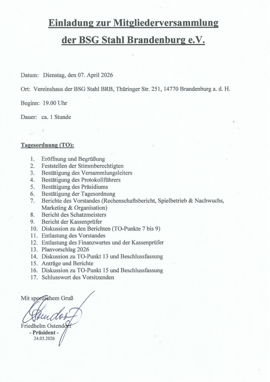 Die BSG Stahl Brandenburg e.V. lädt ihre Mitglieder zur diesjährigen