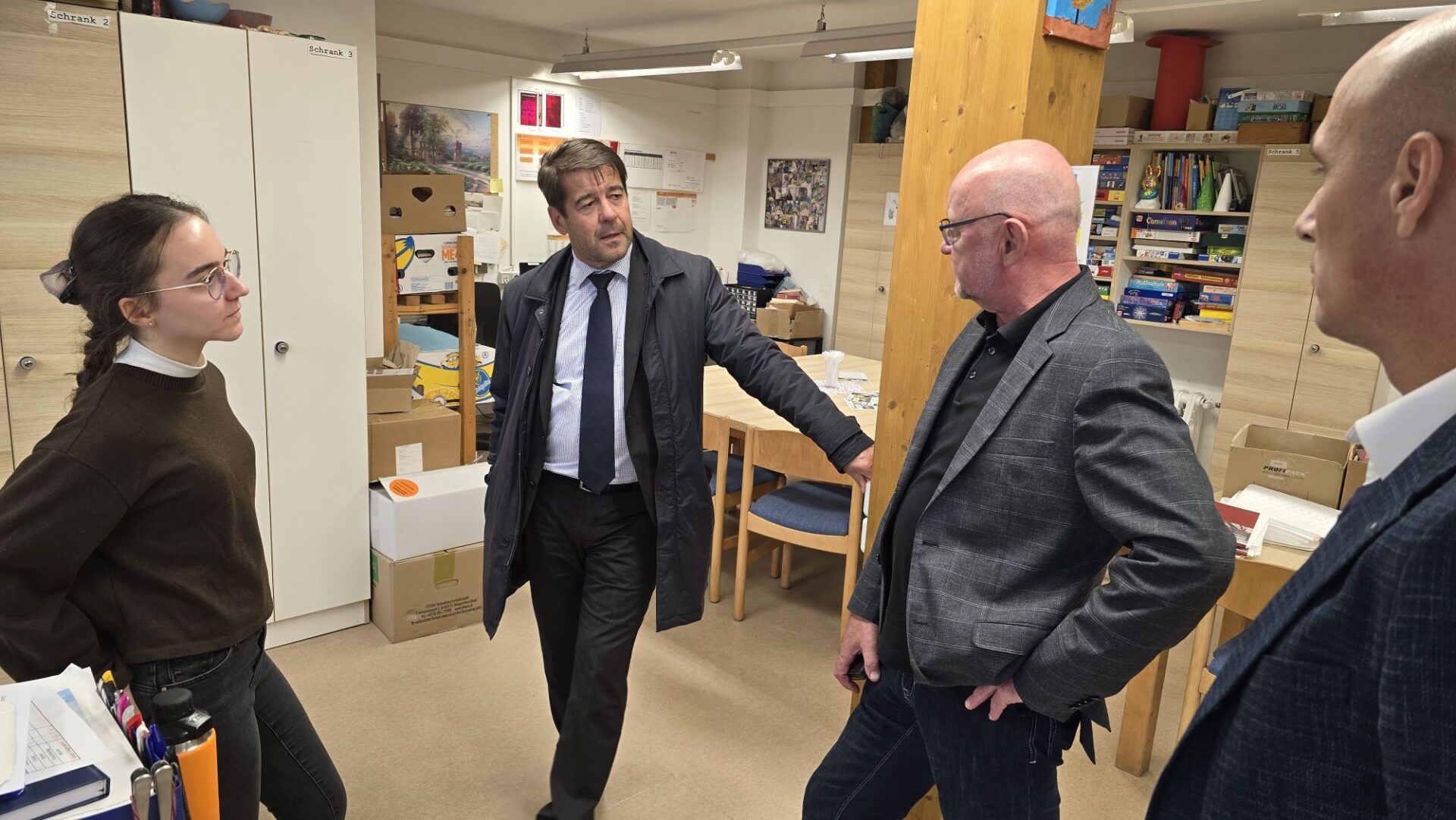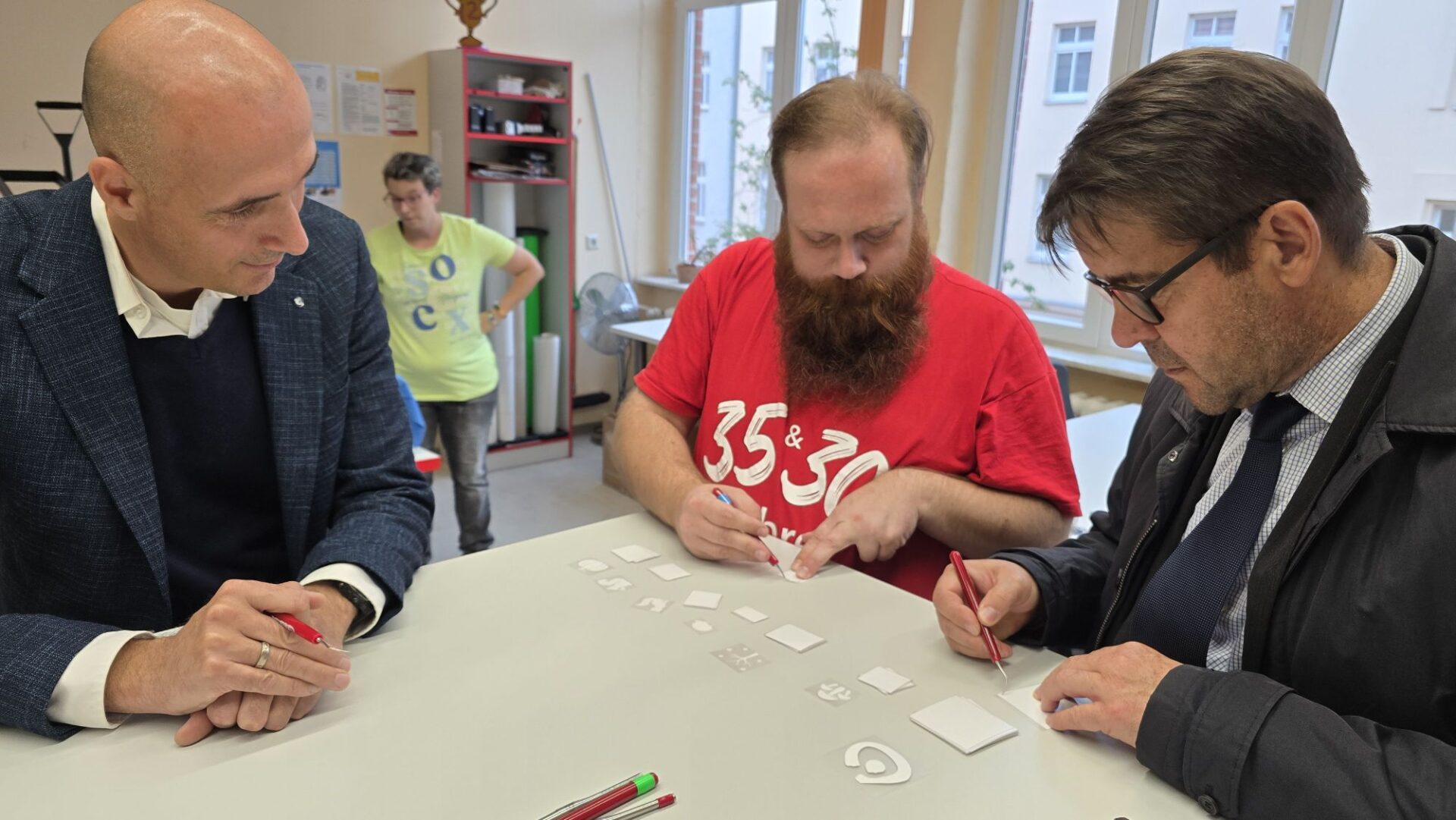 Oberbürgermeister Steffen Scheller hatte mit seinen Besuchen den Onlinebuchhandel „Schmökerhöker“ in der Warschauer Straße 11 erkunden wollen, wo gelesene Bücher bewertet und für den Weiterverkauf vorbereitet werden. Und er wollte genauer wissen, was sich hinter dem Tor zur Zweigwerkstatt in der Wredowstraße tut. Dort tat sich ein erstaunlich großes Arbeitsfeld auf, das vom Berufsbildungsbereich bis zur Textilveredlung reicht. Mitarbeitende erläuterten, welche Eigenprodukte wie entstehen, darunter Kissen und Sitzhocker, Yoga-Matten und -augenkissen. Für eine namhafte Gabelstapler-Firma werden Öldecken einzeln verpackt, für Sondereditionen namhafter Getränkehersteller Etiketten mit filigranen LED-Spielereien bestückt.