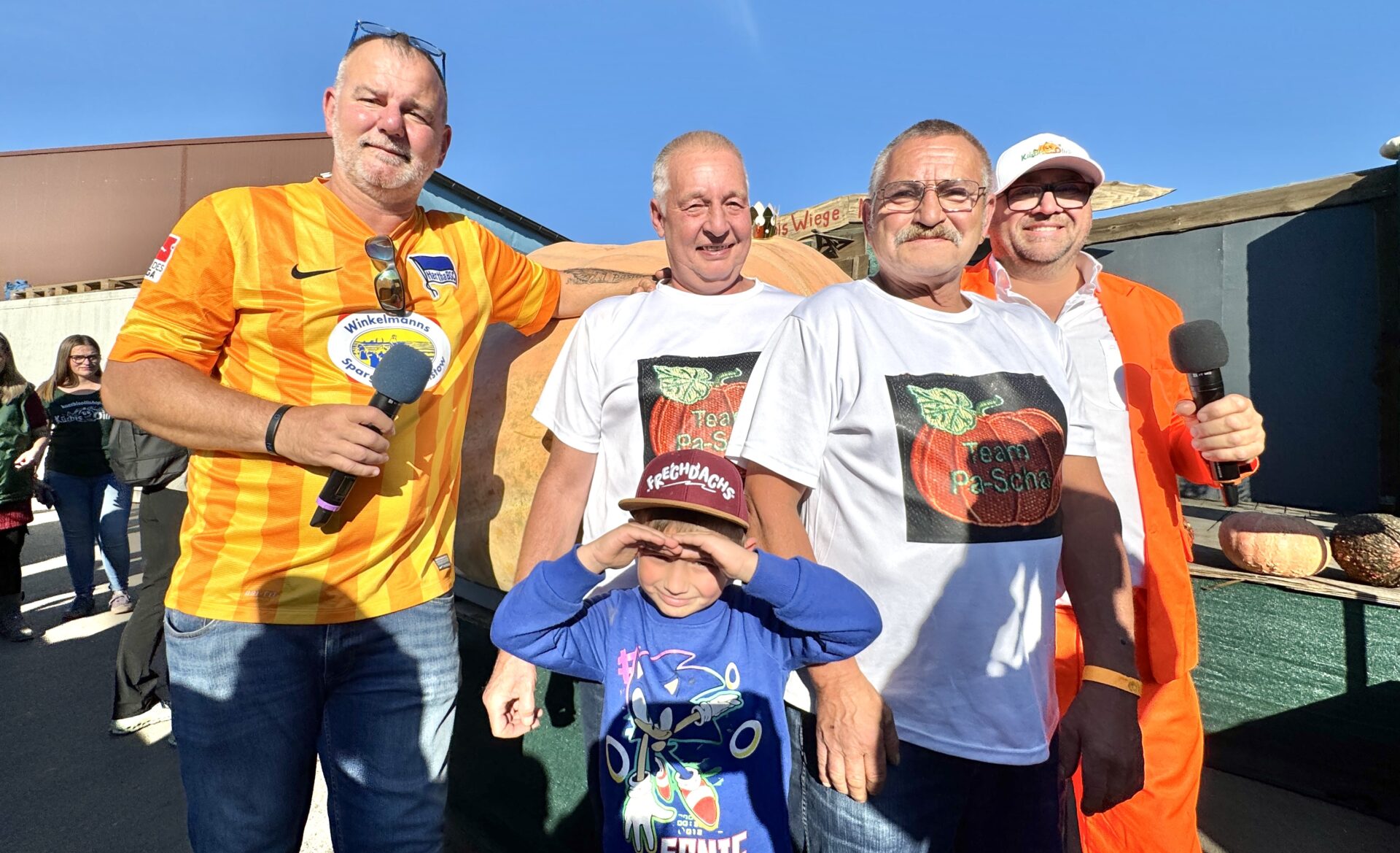 Finn-Luca, 6 Jahre alt, konnte die Anspannung kaum ertragen: Der Kürbis seines PaScha-Teams war das letzte Exemplar, das bei der Großen Kürbis-Wiegemeisterschaft gewogen wurde. Die Freude war dann riesengroß: 1.034,8 kg – neuer Brandenburger Rekord! Und erstmals ein Brandenburger Kürbis von über 1.000 kg.