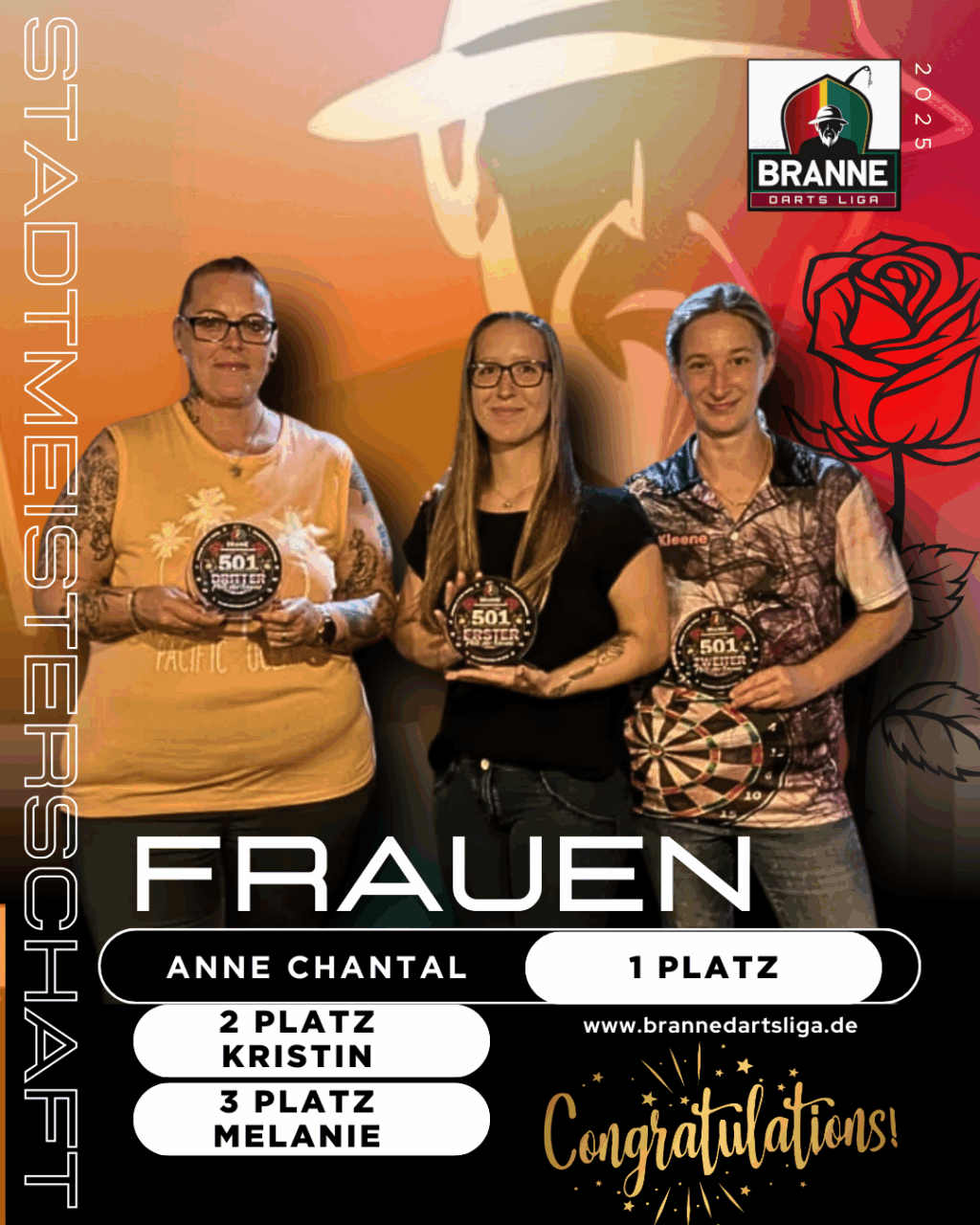 Mit 10 hochmotivierten Teilnehmerinnen startete das Turnier bei den Damen. Anne-Chantal Munck zeigte von Beginn an, dass sie die Konkurrenz im Griff hat und pulverisierte die Punktetafel mit beeindruckenden 27:7 Legs. Kristin Darweger und Melanie Gabbe kämpften tapfer, konnten aber die geballte Präzision von Anne-Chantal nicht stoppen. Mandy „Böhse Lessy“ Althoff sorgte mit ihrem Spitznamen für Gesprächsstoff – und zeigte auf der Scheibe, dass sie mehr draufhat, als ihr Name vermuten lässt. Das Publikum lachte, staunte und fieberte mit – besonders bei Jasmin Schulze und Bianka Meyer, die sich in knappen Matches gegenseitig die Nerven raubten. Am Ende gab es klare Siege, aber jede Teilnehmerin konnte sich über ein Wochenende voller Adrenalin und Spaß freuen.