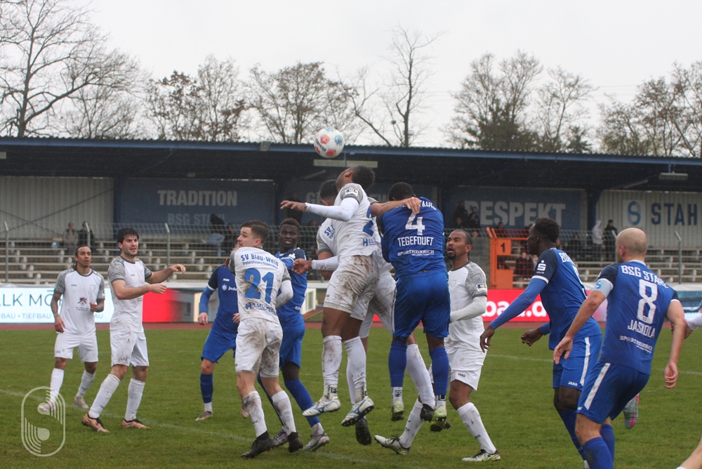 Was die Stahl-Elf auch offensiv probierte, es war alles glücklos. Nennenswert vor der Pause war noch ein Kopfball von Romain Joel Siabe Tegefouet nach einer Ecke und ein Konter in der 40. Minute über Müller, der gut auf die linke Seite passte, doch Ibraima Cante verstolperte die gute Gelegenheit. So freuten sich die Gäste zur Halbzeit über eine glückliche Führung. Ein Angriff genügte. Besonders bitter für Stahl-Schlussmann Felix Baitz, der ansonsten im ersten Durchgang nichts zu tun bekam.