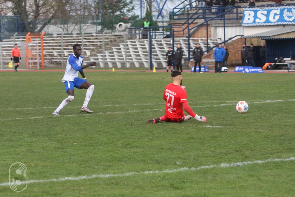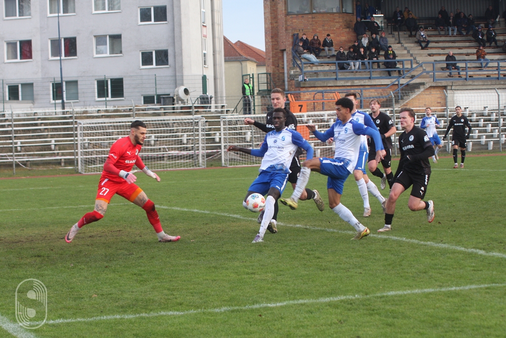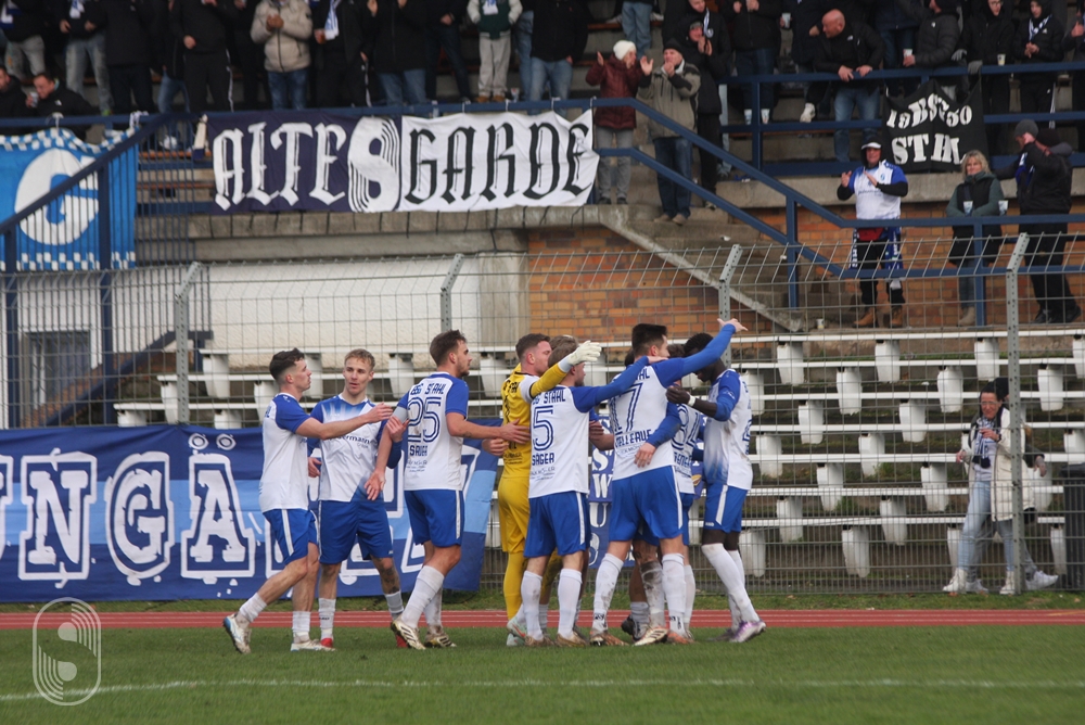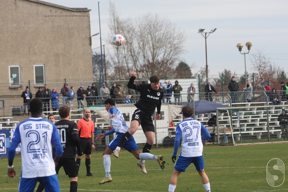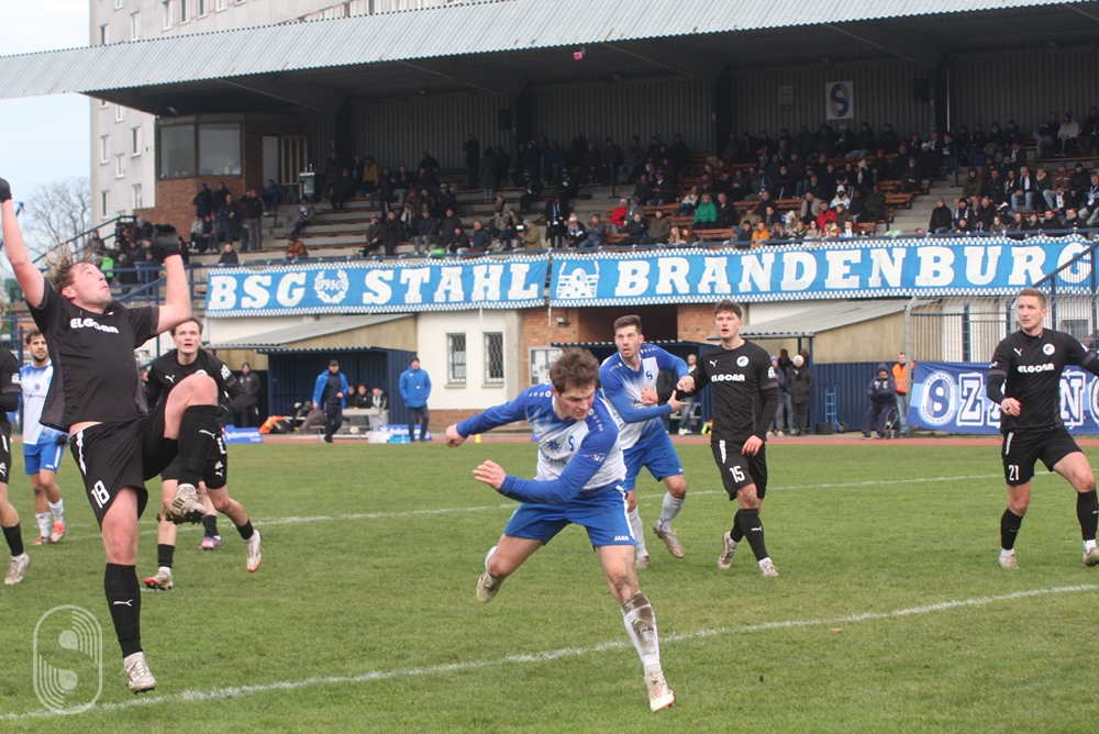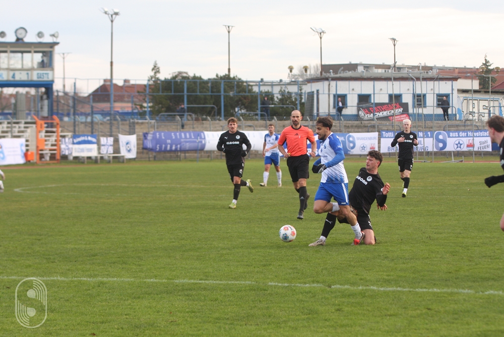 Dies sollte für längere Zeit das letzte Mal gewesen sein, in der die Stahl-Defensive in Schwierigkeiten geriet. Jetzt hatten die Brandenburger ihren Rhythmus gefunden, das Geschehen verlagerte sich zunehmend in die Hälfte der Sachsenhäuser. Amar Roustm hatte noch Pech, das sein Treffer abgepfiffen wurde, doch in der 24. Minute durften die 319 Besucher endlich jubeln. Einen Freistoß Köhns aus 22 Meter ließ Torhüter Zlotogorski prallen, Dellerue regierte am schnellsten und schob zum 1:0 ein. Nur drei Minuten später legten die Gastgeber nach. Eine Eingabe in den Sechzehner lupfte Lamin Jatta auf die Latte, diesmal war Sebastian Hoyer gedankenschneller als die TuS-Abwehr und hämmerte den Ball aus kurzer Entfernung links oben ins Tor.
