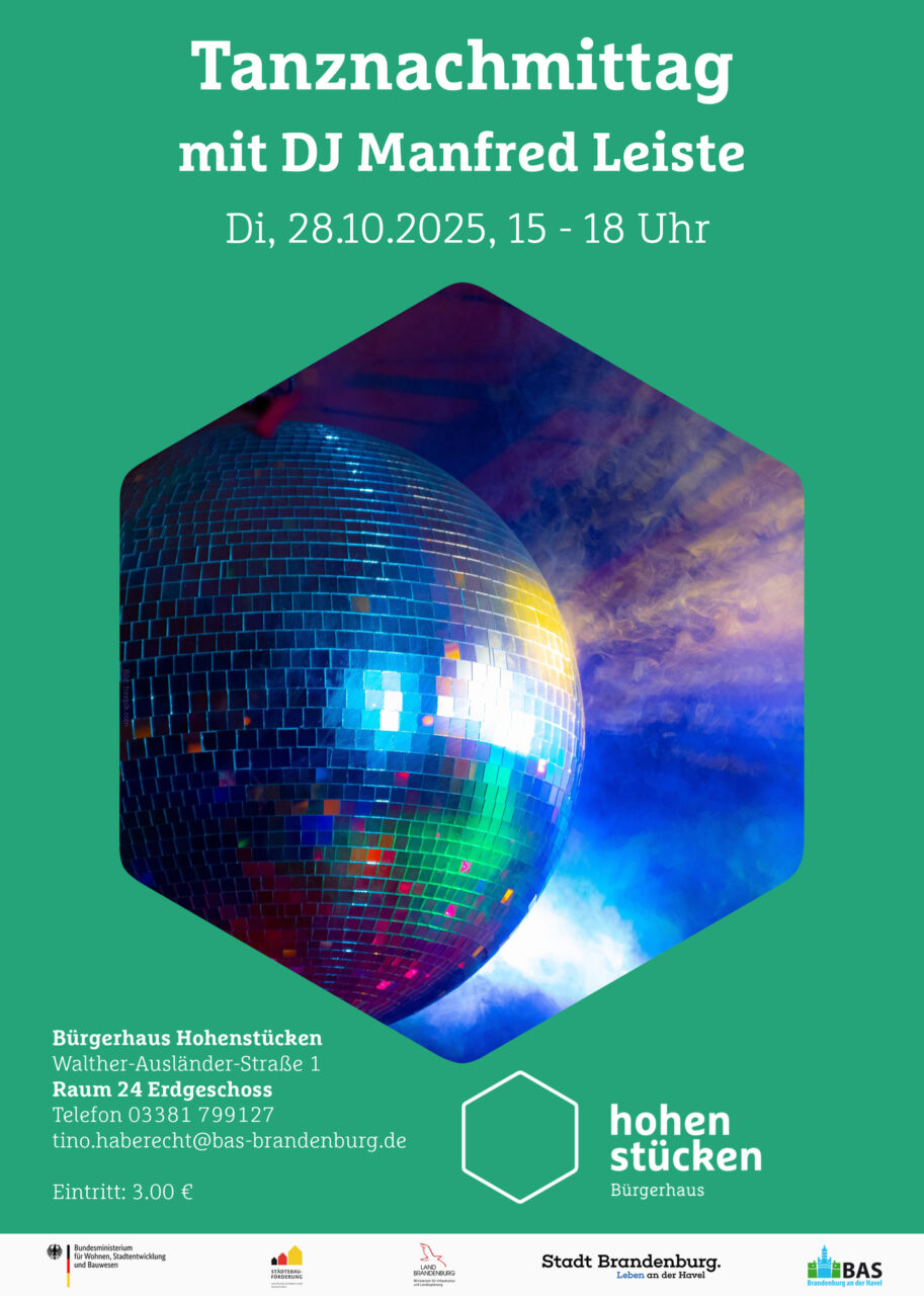 Am Dienstag, 28. Oktober 2025, findet im Bürgerhaus Hohenstücken in der Walther-Ausländer-Straße 1 der nächste Tanznachmittag statt – diesmal mit DJ Manfred Leiste. Die Veranstaltung beginnt um 15:00 Uhr im Multifunktionsraum (R 24) im Erdgeschoss und endet um 18:00 Uhr. Der Eintritt kostet 3 Euro.