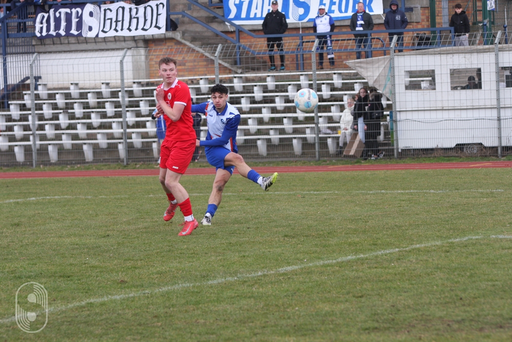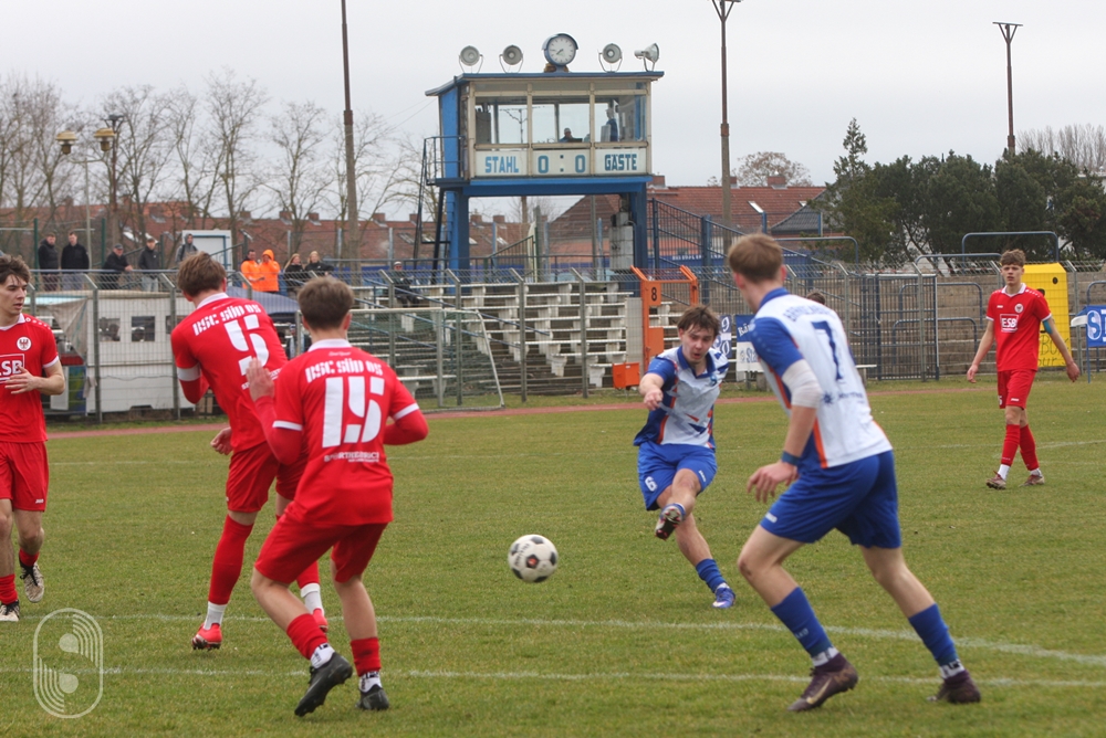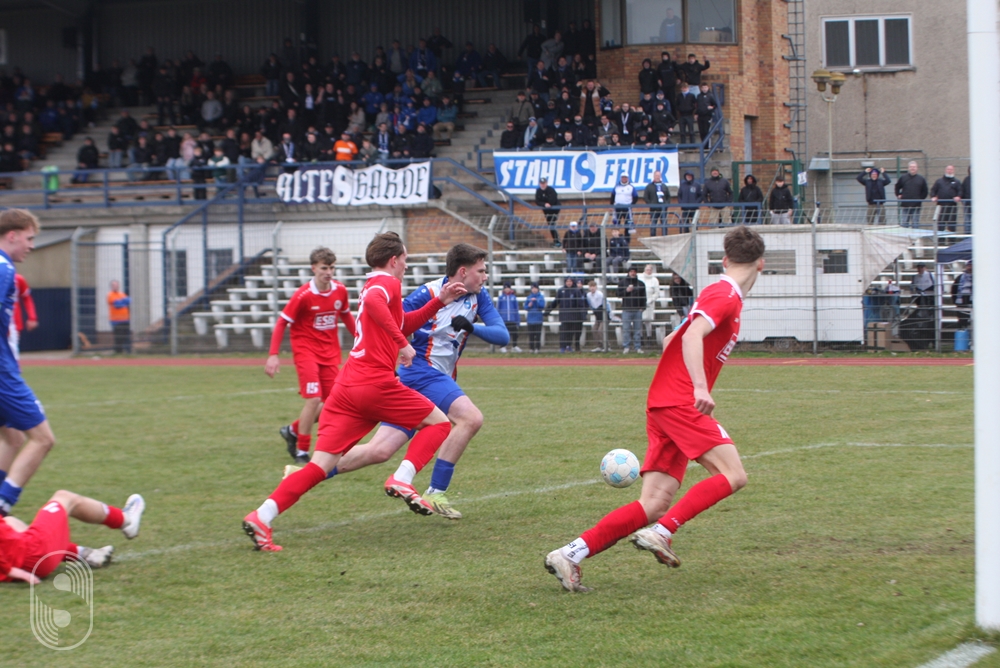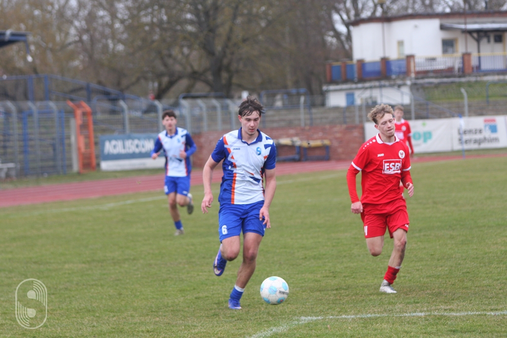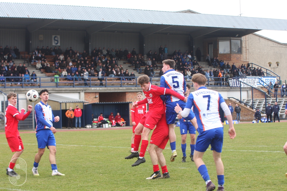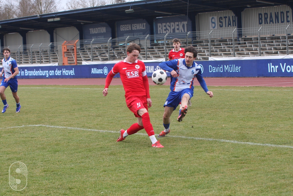 In der U19-Brandenburgliga empfing an diesem Samstag die BSG Stahl Brandenburg den Ortsrivalen BSC Süd 05. 380 Zuschauer wollten dieses Derby sehen und die gute Nachricht vorab, es blieb friedlich auf den Rängen wie auf dem schwer zu bespielenden Boden. Das Hinspiel im Dezember hatte die Stahlmannschaft dominiert und setzte sich auf dem Werner-Seelenbinder-Sportplatz mit 2:0 durch.