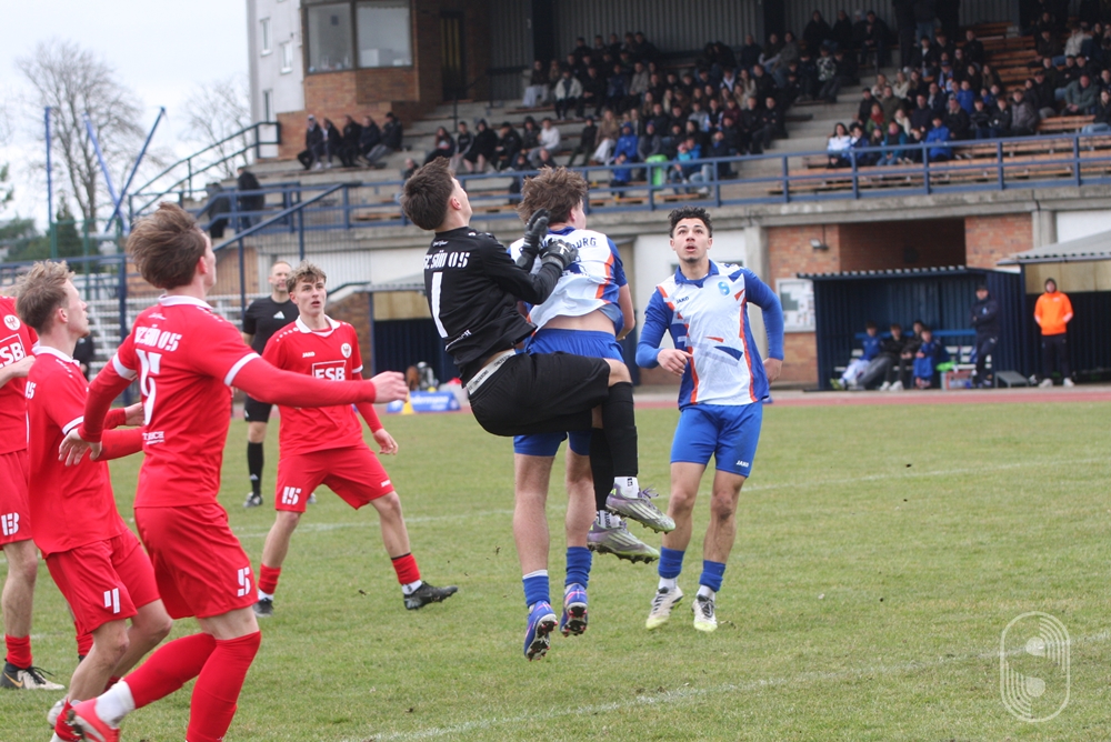 Da die Präzision in den Zuspielen fehlte erarbeiteten sich die Gastgeber zunächst auch keine Möglichkeiten. Nach einer Viertelstunde versuchte es Marvin Gründler aus 18 Metern, sein Schuss ging knapp am rechten Pfosten vorbei. Erst 20 Minuten später gab es die nächste nennenswerte Szene, als Ben Dayan Bleiß sich im Strafraum durchdribbelte, sein Schuss aber gerade noch geblockt wurde. Kurz vor dem Pausenpfiff wollte Moritz Droste nach seinem Kopfball schon jubeln, doch der Süd-Kapitän Leonard Leicht klärte gerade vor der Linie.
