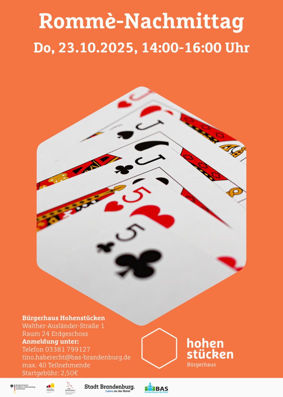 Am 23. Oktober 2025 ist dann wieder ein Rommé-Nachmittag im Bürgerhaus Hohenstücken zu erleben. Die Veranstaltung beginnt ebenfalls um 14:00 Uhr im Multifunktionsraum im Erdgeschoss. Da nur 40 Plätze zu Verfügung stehen, ist eine vorherige Anmeldung mittels E-Mail an Bügerhaus-Koordinator Tino Haberecht erwünscht. Die Startgebühr beträgt 2,50 Euro.