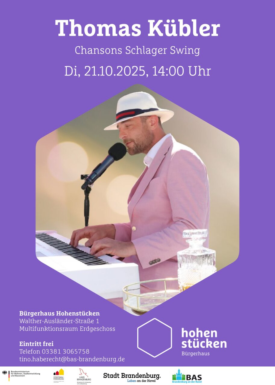 Am Dienstag, 21. Oktober 2025, findet im Bürgerhaus Hohenstücken in der Walther-Ausländer-Straße 1 ab 14:00 Uhr ein Musik-Nachmittag mit Thomas Kübler statt. Er lädt zu einer Reise in die goldenen Zeiten der Musik ein – mit unvergessenen Schlagern, eleganten Chansons und Klassikern der Comedian Harmonists. Mit Charme und Herz verführt er zum Mitsingen und schafft ein besonderes Gemeinschaftserlebnis.