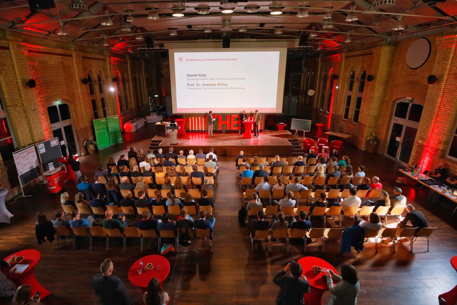 In einem kurzen Eröffnungstalk blickten Brandenburgs Oberbürgermeister Daniel Keip und THB-Präsident Prof. Dr. Andreas Wilms auf das Zusammenspiel von Hochschule und Wirtschaft in der Region. Foto: THB © Nico Gühlstorf